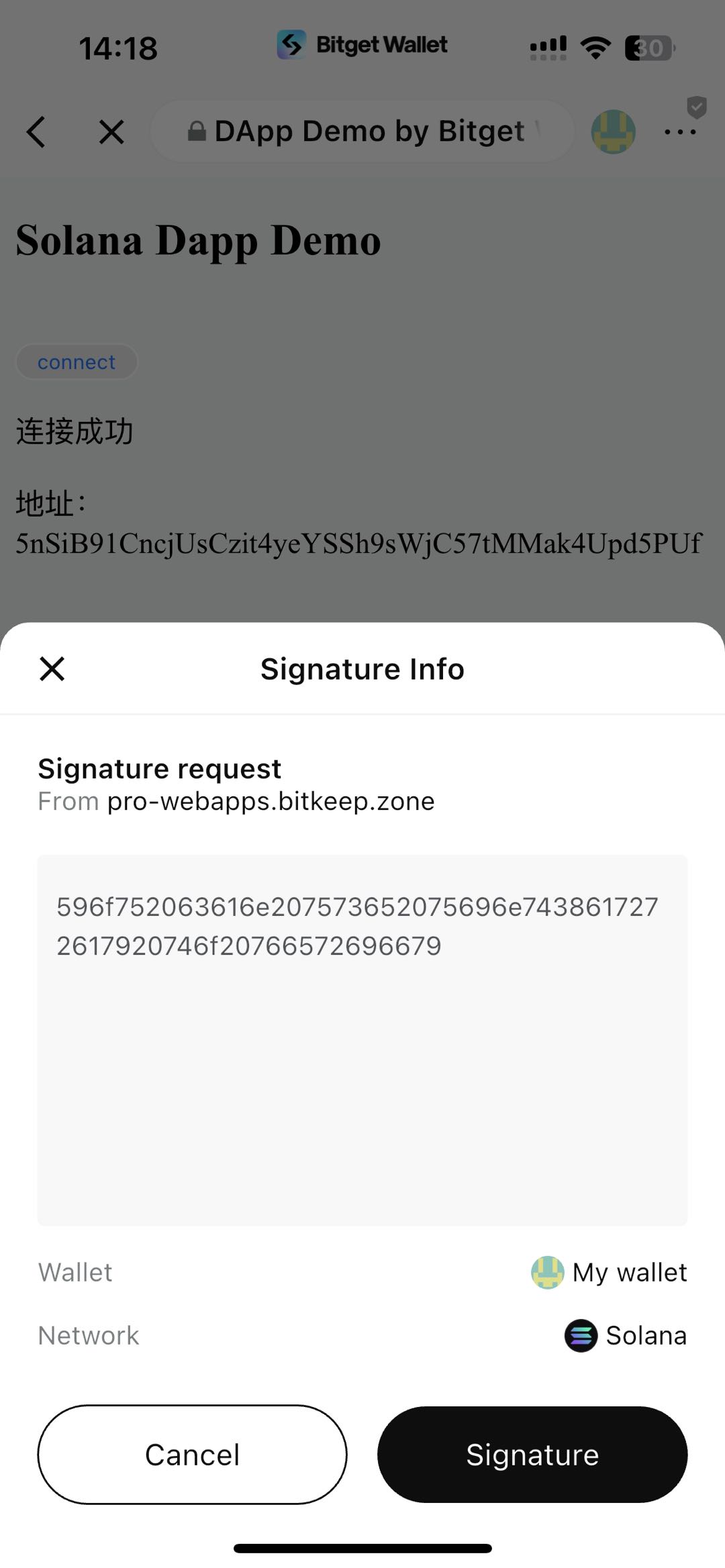 provider.publicKey.toString() // 一旦Web应用程序连接到Bitkeep签名消息